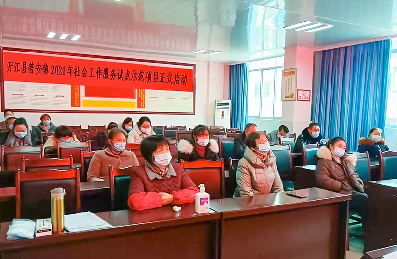 普安镇副镇长廖芳芳指出:社会工作是一项以专业社工理念为指导,以专业的社工方法助人的服务活动。开江县普安镇社会工作服务试点示范项目由省民政厅出资,由达州市万家和社会工作服务中心执行。将会以个案、小组、社区活动三种形式为社区老年人、留守困境儿童、留守妇女提供诸如促进老人身心健康、儿童自我保护能力、女性权益增能等服务,希望社区积极支持、居民踊跃参与,同时希望达州市万家和社会工作服务中心认真实施,促进社区基层治理,增强群众的幸福感和获得感,促进家庭和睦、社区和谐。