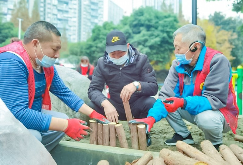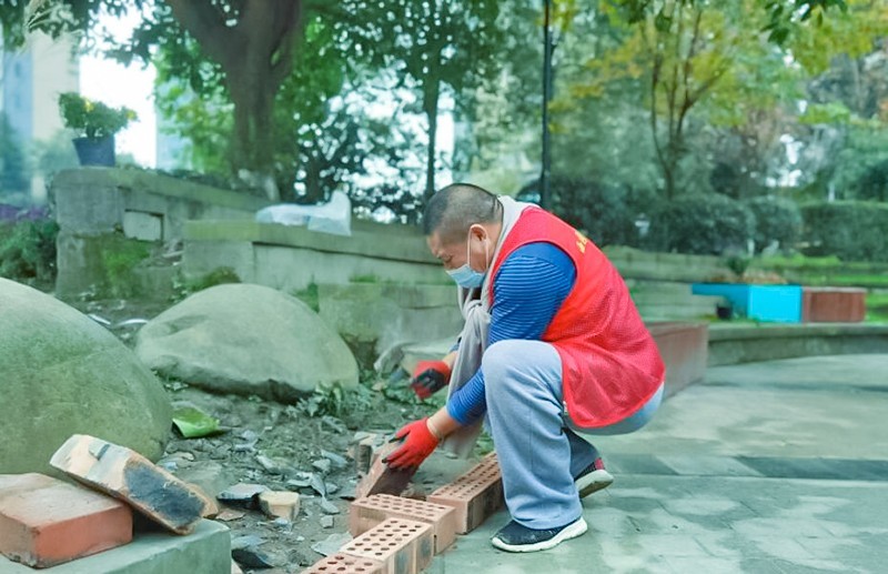 方案有了就付诸实施,志愿者召集令在微信群一发出,就有20余名志愿者报名。项目实施当天,正在活力小广场打乒乓球的杨世伦、杨义建、周章军等多名居民自发加入志愿队伍。当过水泥工的杨义建甚至从家里带来了专业的工具,开凿、砌砖、敷水泥......他熟练的干了起来,“哟喂,杨师傅干的攒劲,手艺不错嘛。”路过的邻居们纷纷点赞,也吸引了不少居民加入队伍中。