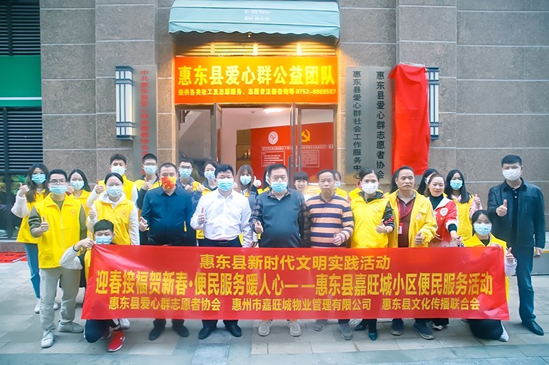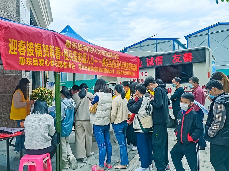为了营造欢乐祥和的节日氛围,弘扬中华民族春节传统文化,促进小区文化建设。1月23日下午,广东省惠东县爱心群志愿者协会联合惠州市嘉旺城物业、惠东县文化传播联合会,在平山街道嘉旺花园物业服务中心门口,开展惠东县新时代文明实践活动之迎春接福贺新春·便民服务暖人心——惠东县嘉旺城小区便民服务活动。