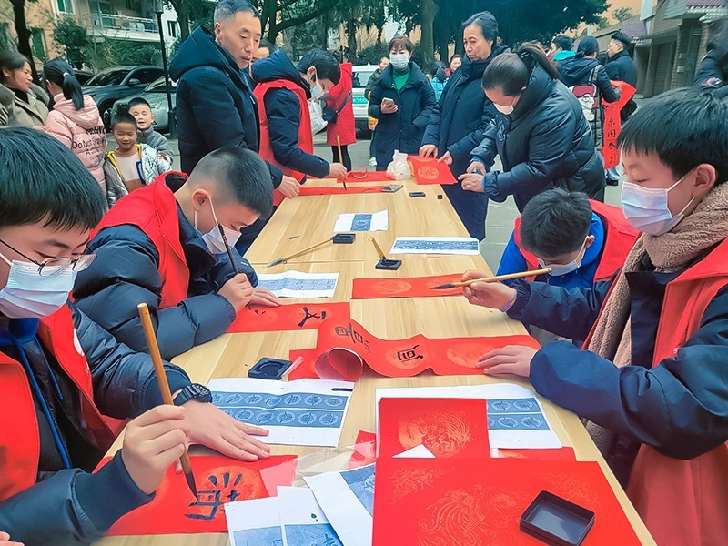 今年的春晚系列活动共走进六个居民小区,节目类型包括歌舞、脱口秀、杂技、魔术、绝活等,活动间歇还设计党史知识等问答环节。富有力量和节奏感的鼓声将现场的情绪点燃,给冬日带来了满满的热情,也展现出了社区居民蓬勃向上的精神气儿。在欣赏之余,观众还能领取书法协会的书法爱好者当场在喜庆红纸上写下的满满祝福的春联。