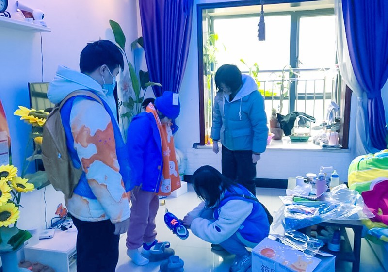 随后,社工站社工与向阳花开儿童关爱社成员将温暖包送往两名特困儿童家中。