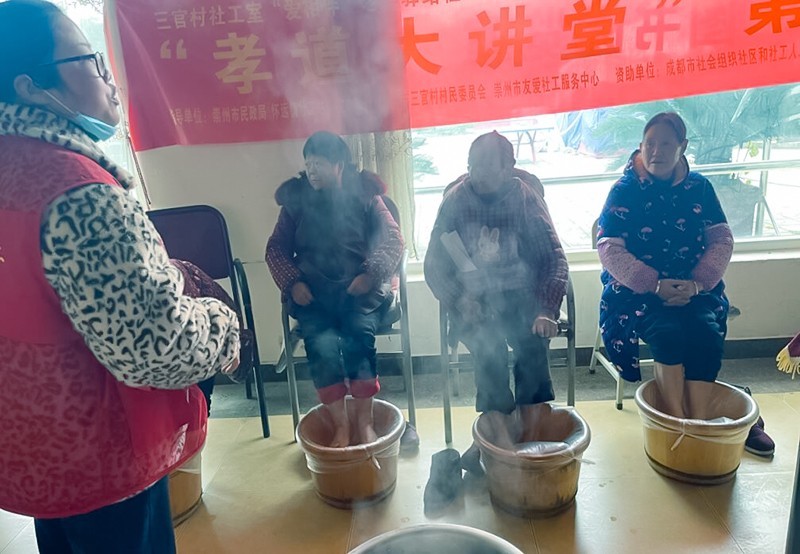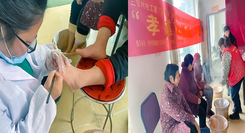本次活动是秉着对老人的一份孝心,爱心、关心来着实开展。主要分围3个环节,首先社工工作人员为老人们讲解孝道文化,孝道知识。老人们都听得很认真,并分享着身边的光荣美好的事迹。其次在活动中工作人员也倡导儿女们不管在工作中有多么的繁忙在家都可以为老人们洗脚端水,随后邀请专业的技师为老人修整脚上的顽疾,实地解决老人们的痛苦。老人们经历了艰难的生活,到现在能享受村社区及社会给予的这一份美好,感到非常的高兴,心理甚是欢喜与感激。不由的感慨社会越来越好,享受了他们从来都没有享受过的待遇。