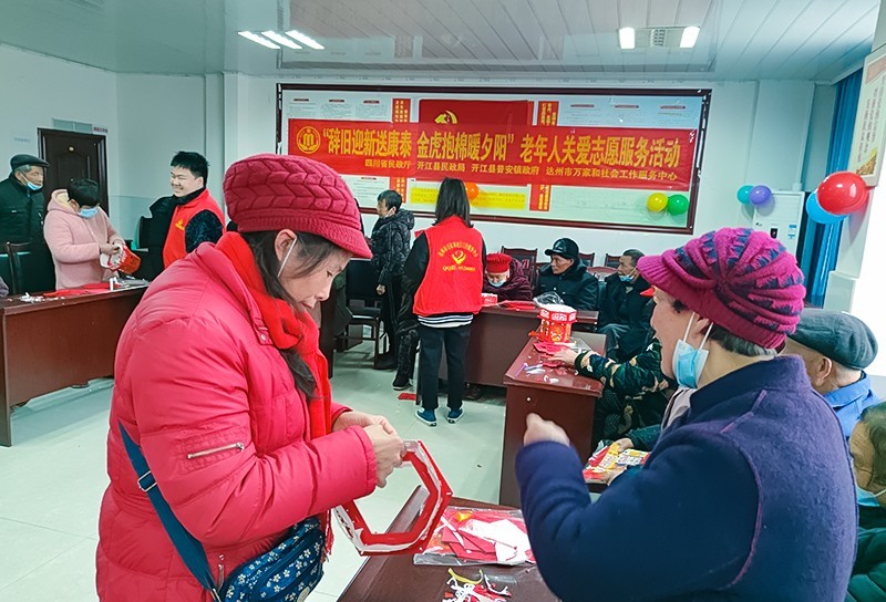 1月24日,达州市万家和社会工作服务中心携手开江县普安镇政府在该镇富康社区开展了“辞旧迎新送康泰 金虎抱棉暖夕阳”老年人关爱志愿服务活动。达州市万家和社工中心的社工陪伴来自普安镇各社区(村)的30名独居、空巢老人一起玩游戏、跳健身操、做灯笼、唱红歌,好不热闹。社工陪伴老人们载歌载舞庆祝即将到来的春节,一起共度美好时光。让老人深切感受到了党和政府以及社会对独居、空巢老人的关爱。