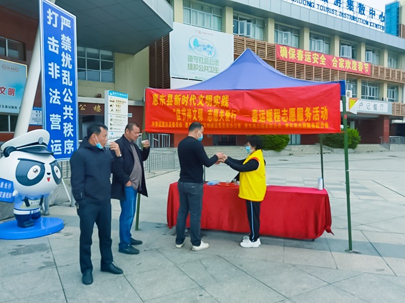 1月19日至29日期间,由共青团广东省惠东县委员会、惠东县精神文明建设委员会办公室、惠东县志愿者联合会、惠东县志愿服务联合会主办,惠东县爱心群志愿者协会承办的惠东县新时代文明实践“佳节尚文明 志愿关爱行”——春运暖程志愿服务活动走进惠东县汽车客运总站,为广大返乡人员提供暖心热茶、疫情防控、行李搬运、线路咨询、协助购票、重点帮扶等志愿服务,帮助群众平安过年、顺利返程。