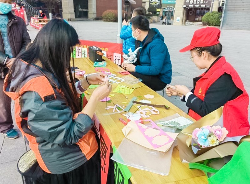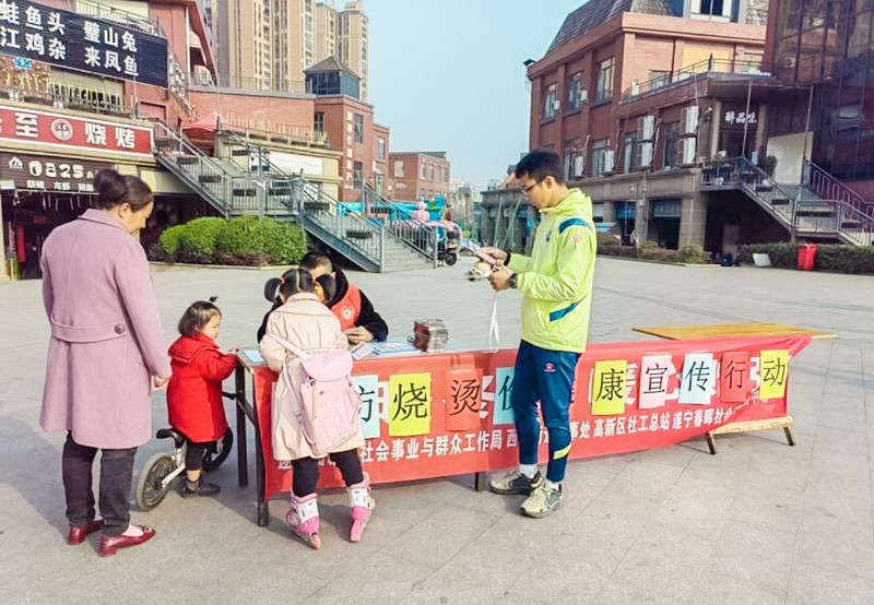 义诊区,高新区社工总站资源链接到遂宁市第一人民医院为居民进行口腔、骨科方面的检查,同时为居民带来了健康咨询与急救知识讲解,让居民了解自己的身体状况;义卖区,“小小志愿者”们带着自己的玩具,铺展在准备好的区域,并主动向来往行人推销或是和小朋友交换玩具,提高了孩子们的分享和奉献意识;义剪区的爱心理发师们早早来到现场进行准备,运用娴熟的技术为居民们服务,同时也跟居民们聊起了天,让居民感受到了温暖;宣传区,志愿者们提高发放宣传资料等形式积极向居民宣传预防烧烫伤知识,提高居民们的健康防护意识,另一边,我们的志愿者向来往的行人讲解绿色殡葬政策,发放宣传单页,以此提高广大群众对殡改的认识度和重视度,积极营造和谐的文明环境;手工制作区,志愿者们正在和居民朋友一起进行手工花束制作,亲手制作的手工花将被送到社区的高龄老人手中,大家一折一卷中都非常认真,倾注着自己的爱与温暖。