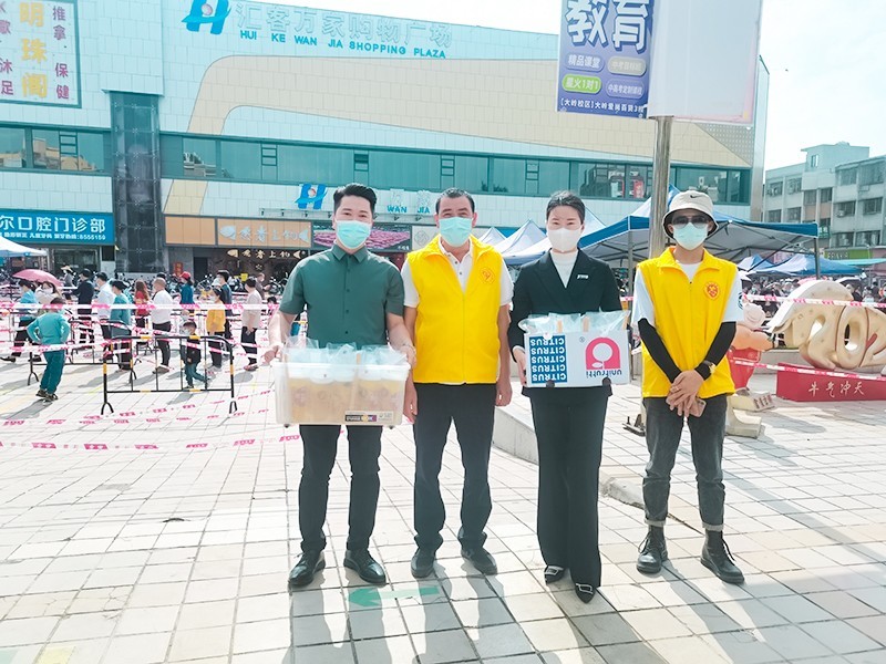 3月6日,同时是惠东县爱心群志愿者协会志愿者的爱心人士邓显峰,给大岭鞋城、新安社区等四个核酸检测点送去了50份李记糖水,珍妮美业联合一夫茶送去了38杯饱含着满满爱心的“一夫爱心手打柠檬茶”。