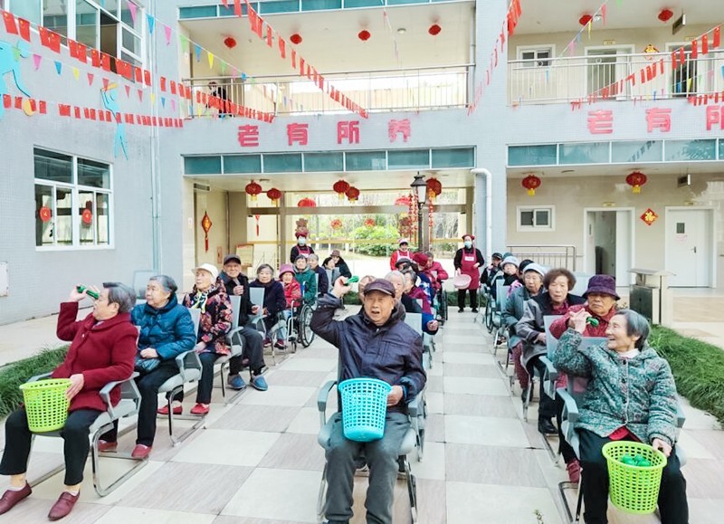 老人纷纷拿着自己喜欢的颜色认真地为图画填色;部分老人眼睛和手不太方便,工作人员带着他们在室外玩起了开火车、保龄球、套圈圈等游戏。