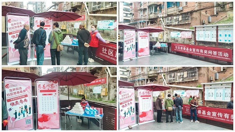 活动正式开启前,项目工作人员和慈善志愿者在社区门口设立宣传展架、张贴横幅向来往社区居民宣传活动,呼吁他们参与此次慈善基金宣传有奖问答活动,认识、了解龙井街社区慈善基金。