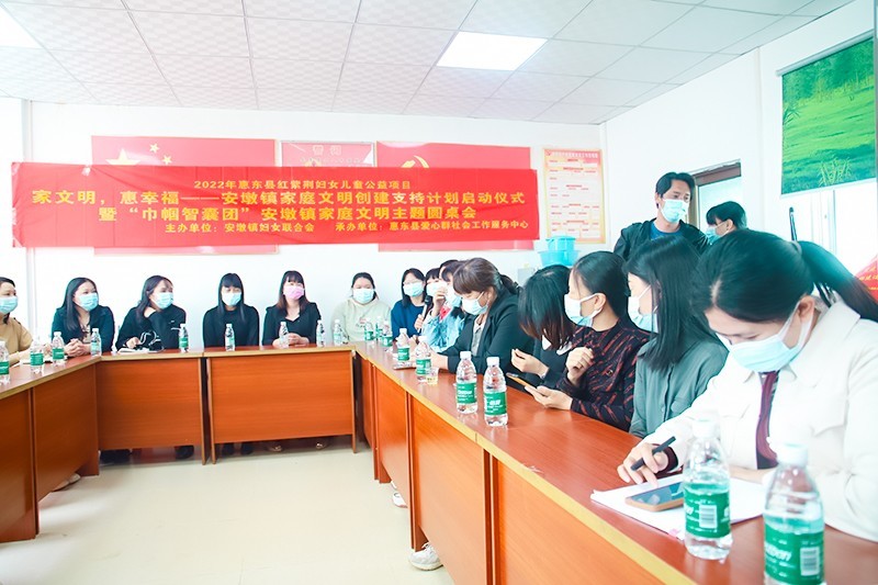 为充分发挥集体的智慧和力量,促进妇女骨干的交流与沟通,提高妇女骨干建言献策的积极性,开拓妇女骨干基层工作新思路,创新工作方法。4月1日上午,由广东省惠东县安墩镇妇女联合会主办,惠东县爱心群社会工作服务中心承办的家文明,惠幸福——安墩镇家庭文明创建支持计划在安墩镇社区家长学校开展项目启动仪式暨“巾帼智囊团”安墩镇家庭文明主题圆桌会,本次活动由项目启动仪式和家庭文明主题圆桌会两部分组成,共计30名安墩镇村妇联执委参加。