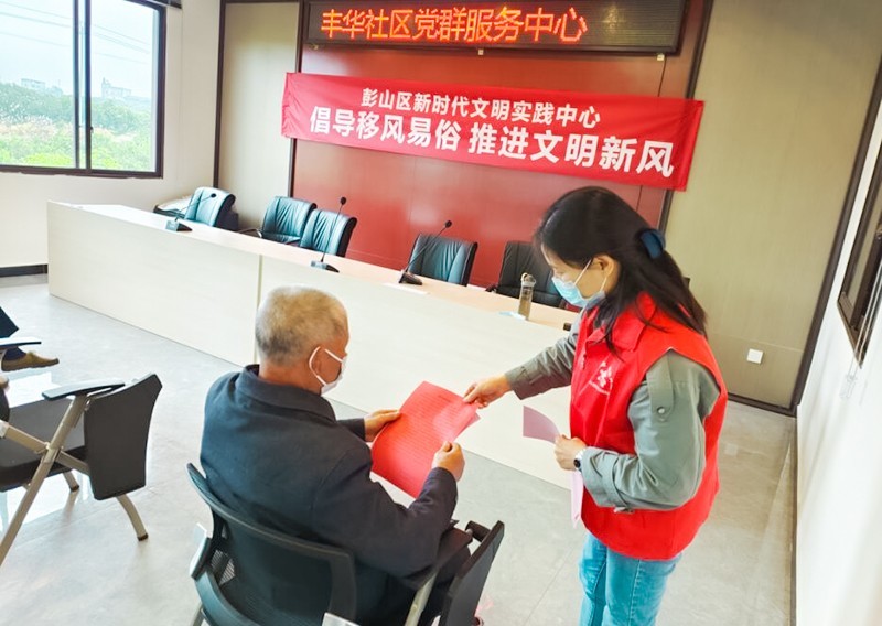 在公义场社区红旗小区志愿者通过发放倡议书、主题宣讲等从根本上改变小区居民的思想意识,破除几千年来封建社会在婚丧问题上遗留给人们的旧思想、旧风俗、旧习惯,树立文明节俭的婚丧新风。