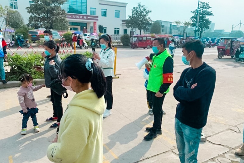 遂宁春晖社会工作发展中心驻沱牌镇社工站社工联合射洪市微心愿社会工作服务中心一同战“疫”,在核酸检测现场,维护秩序,为居民解答疑惑,帮助老年居民出示健康码或电话号码等。