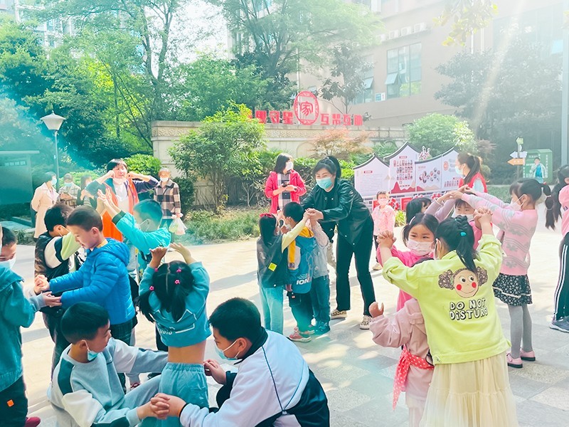 在“松鼠与大树”破冰游戏中,孩子们3人一组,两人扮成大树,伸出双手搭成―个圆圈;一人扮成松鼠,并站在圆圈中间。站点老师发出口令“猎人来了”“刮大风啦”“地震啦”,扮演不同角色的孩子们听到口令后快速改变自己的位置,落单的孩子则为大家表演一段才艺。大家在此游戏中玩得不亦乐乎,哈哈大笑,快速营造了愉快有爱的氛围。