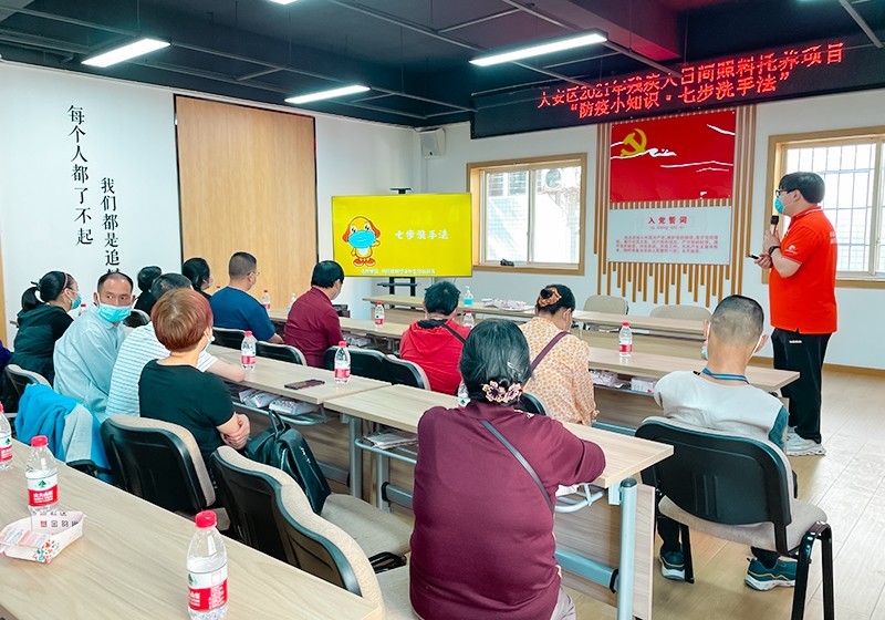 为进一步传递社会对残障人士群体的关怀,增强对疫情防控的了解,引导其自觉加强个人防护意识。4月26日,由四川省自贡市大安区残疾人联合会主办,大安区龙井街道办事处承办,自贡市社会组织社工和社区治理服务中心执行的大安区2021年残疾人日间照料托养项目——“防疫小知识·七步洗手法”健康主题活动在龙井街道多功能会议室举行,来自辖区的30余组家庭参加了活动。
