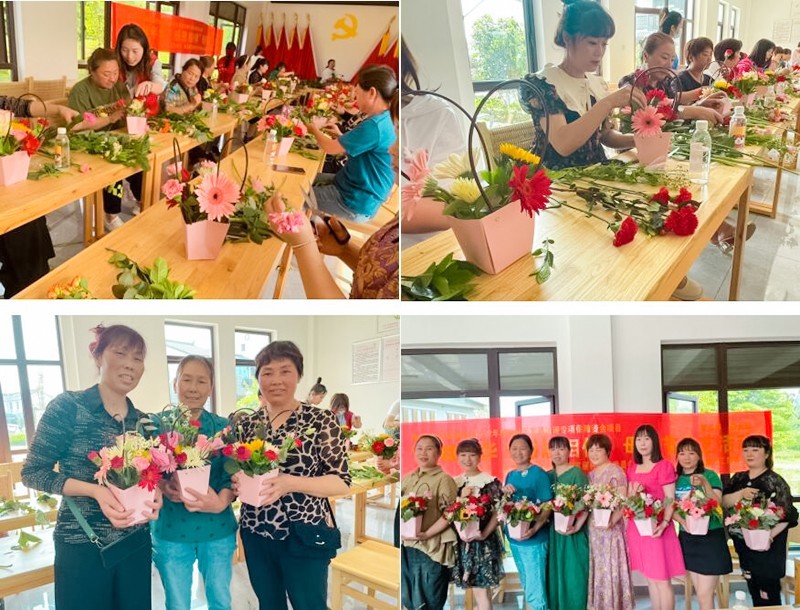 “花艺品生活·芬芳楼宇香”。在芬芳四溢的花香下,社工简述了母亲节的来历和含义,并邀请了花艺老师进行现场培训,从颜色搭配、空间搭配、包装方法、后期养护等方面进行了讲解;听完花艺师的介绍,现场的村民朋友们个个都兴奋不已,跃跃欲试。修剪枝叶、编绿叶、摆造型……大家精心构思、巧妙搭配,把自己的创意和想法通过一朵朵鲜花呈现出来,在设计的过程中彼此之间相互讨论交流想法,在花艺老师的指导下,一束束饱含对母亲感恩之情的花束完成了,每一件都独一无二,每一束都灿烂美好,每一束都饱含着对母亲的美好祝愿。