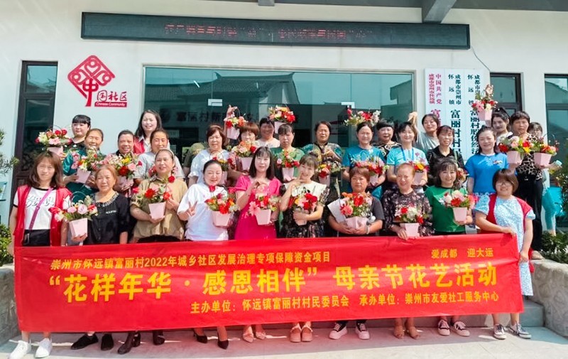 母亲节来临之际,为弘扬尊老爱幼的传统美德,感恩无私母爱、感恩相伴。5月7日,由四川省崇州市怀远镇富丽村村委会主办、崇州市友爱社工服务中心承办的怀远镇富丽村2022年城乡社区发展治理专项保障资金项目——“花样年华·感恩相伴”母亲节花艺活动在富丽村村委会顺利开展。