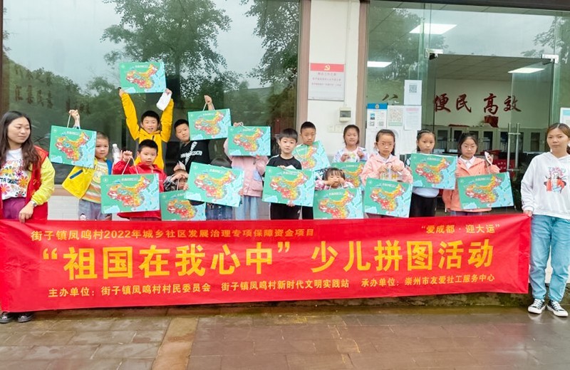 为激发社区青少年的爱国之情,更好的发扬爱国主义教育。5月21日,由四川省崇州市街子镇凤鸣村村民委员会主办、崇州市友爱社工服务中心承办的街子镇凤鸣村2022年城乡社区发展治理专项保障资金项目--“祖国在我心中”少儿拼图活动在凤鸣村村民委员会进行。