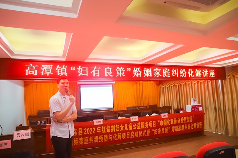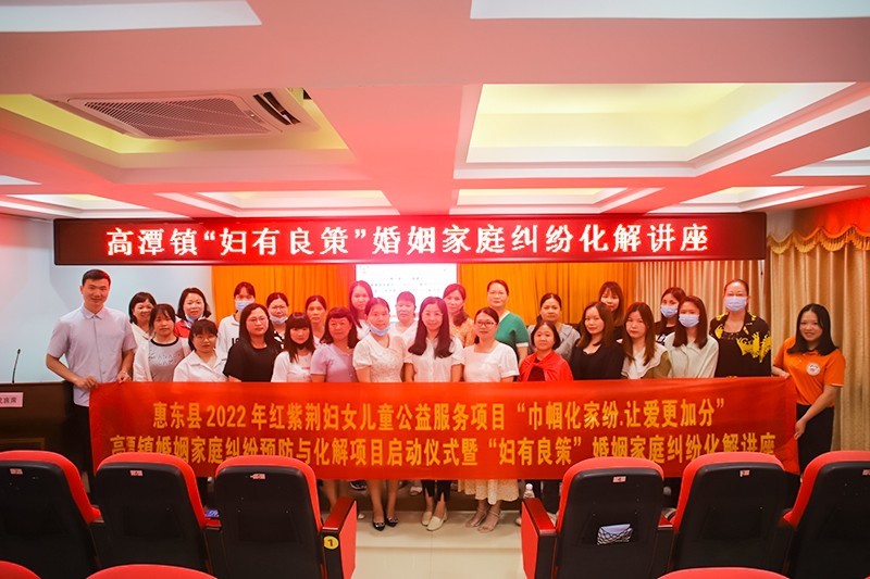5月25日上午,由广东省惠东县妇女联合会、高潭镇妇女联合会主办,惠东县爱心群志愿者协会协办,惠东县爱心群社会工作服务中心承办的“巾帼化家纷·让爱更加分”--高潭镇婚姻家庭纠纷预防与化解项目启动仪式暨“妇有良策”婚姻家庭纠纷化解讲座在高潭镇政府三楼会议室开展。
