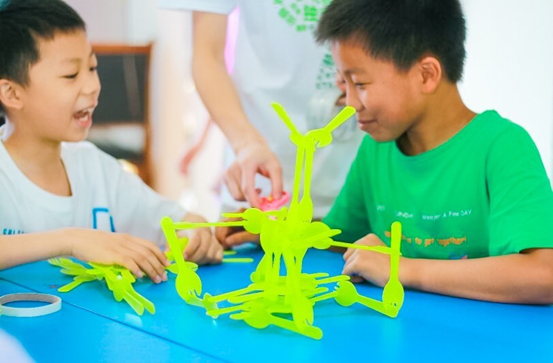孩子们对夏令营的热情就像太阳公公对大地的热情一样,炙热又充满了期待。带着一天的欢乐入眠,迎接更具挑战的一天。7月4日,孩子们在志愿者哥哥姐姐们的带领下,进行了一场“春”之行。上午,大营的儿童回忆了二十四节气,跟随立春的脚步“来到”苏州,参观苏州的园林,学习徽派的建筑形态,随后在游戏环节中,志愿者带领大家尝试用勺子搭建属于自己的建筑,小朋友展开丰富的想象在团队协作下都建造出了独特的作品。