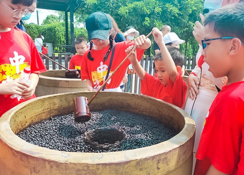 我们来到了中坝酱油的生产地--清香园。在这里解说员给孩子们讲解了清香园生产酱油的历史。同时,开展了打酱油,品尝酱油拌饭,观看生产发酵过程。通过自己动手实践,孩子们深入了解酱油的生产。