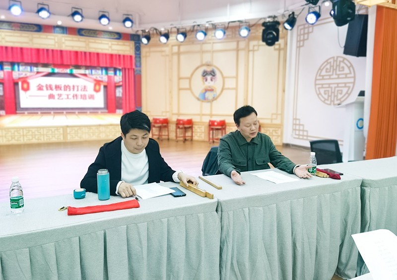 培训过程中,两位老师分别从金钱板的基础知识、基本打法、基本节奏、韵律、唱法等方面进行了详细介绍,重点以岳池本土金钱板作品《看白塔》为例,用作品分析处理、示范辅导、全员练习、个别指导等方式让师生们学习金钱板的表演技巧,参培师生专心学习、认真领会,感受了金钱板这一曲艺艺术的独特魅力。