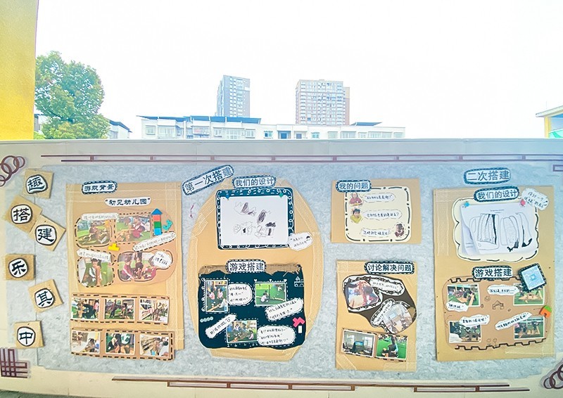 各班级利用符合幼儿视角的楼道、走廊等墙面,通过游戏过程图片、文字解说、视频等形式展现精彩的游戏主题案例。在游戏主题选材上,老师们从幼儿兴趣出发,给予充分的游戏材料、时间、空间的支持,让幼儿能够最大限度地自主游戏、自由探索。在大六班的《马路来啦》游戏主题案例中,孩子们设计的马路从出现道路塌陷问题,再到不断完善:拓宽路面、增加坡道的硬度、改进材料、增设护栏和交通标志。通过多次建构,幼儿的知识经验不断积累和丰富,他们建构游戏的内容范围更宽广,建构物的结构也变得更细致和复杂。幼儿在问题情境的带动下引发思考与想象,幼儿的思维、探索与问题解决能力得到发展。同时幼儿在经过“困难、问题、假设、验证、结论”的五步法,不断发展思维、不断创新游戏,进行着有效的学习迁移和深入学习。