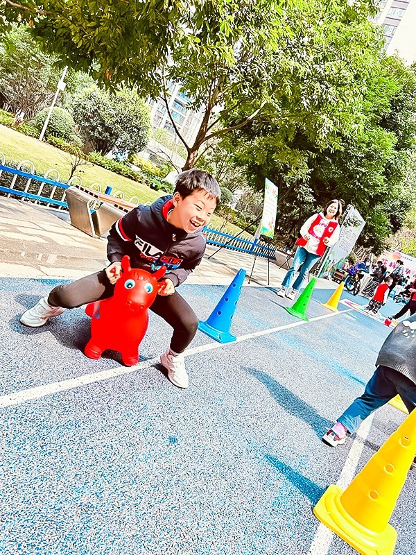 下午一点,活动在欢快的音乐氛围中拉开序幕。大人和孩子为一组分别奔向了各个游戏点位:妈妈和孩子默契十足,在统一的口号下很顺利的通过了手脚并用环节;光盘拔河则是由更有力气的爸爸上阵,宝贝和爸爸完美配合,轻松通过;投石问路游戏大人和孩子同时依次投沙包累计完成80分则过关,小朋友们和爸爸妈妈都默契同步,节奏感十足;最欢乐的就是穿山越岭这个项目了,宝贝们骑着红色跳跳马,穿越障碍回到终点,充分锻炼了宝贝们的协调性。