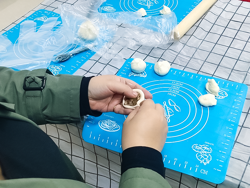此次活动以“技能学习”为主题,活动现场,擀面杖、面皮、肉馅儿、擀面垫、一次性手套....道具面面俱到,简单的介绍拉开了活动序幕,主讲老师正式开始包包子技能教学,“第一步,请大家将手中的面团根据自己想包的包子大小分为若干份......”,大家都跃跃欲试,迫不及待想一展身手,左手拿着包子皮,右手放馅,开启动手尝试,志愿者及教学老师也纷纷助力,帮助大家一起动手包包子,活动现场弥漫着幸福的味道,不一会儿,一个个小包子就成型了。最后,项目组还为每位活动参与人员发放了成品包子,让每位参与者学有所成、学有所获。