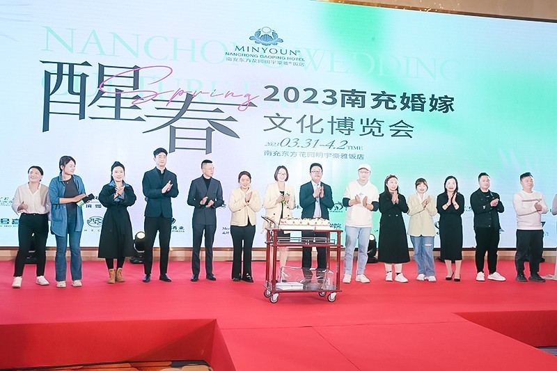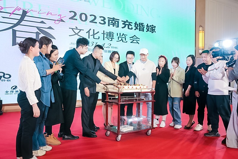 切蛋糕作为婚嫁文化博览会开幕的重要环节,充满着惊喜与期待。在各参展商及120人宾客的注视下,硕大的蛋糕被缓缓推上舞台。各参展商的代表共同切开“南充东方花园明宇豪雅饭店醒春2023婚嫁文化博览会”醒目的字样蛋糕,象征各合作伙伴在此次婚博会上创造不菲的业绩,同时也预示在婚礼市场这块蛋糕上,我们婚礼相关产业的营销需要整合,推广需要整体,抱团才有影响,合作才能共赢。