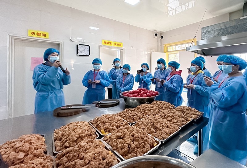 本次共邀请24名家长参加“五个一”明厨亮灶活动,包括一次食堂参观;一次汇报交流;一次午餐试尝;一个食堂工作建议;一个活动感悟。入园签到后,家长们严格按照幼儿园食堂管理规定,穿戴好一次性卫生防护衣、口罩、帽子、鞋套进入食堂。在邹园长的带领下,大家跟随每日食品配送和加工的路线,实地查看了幼儿园厨房的环境卫生、原料采购、餐具消毒、食物的加工与储备等各个方面的工作实施情况。干净整洁的环境、规范有序的操作流程给家长们留下了深刻的印象。