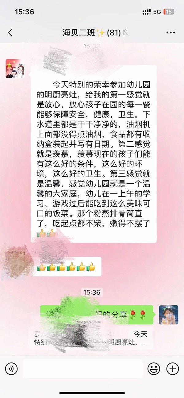 家长代表们在品尝午点以及膳食后,纷纷表示:“幼儿园的食谱安排注重膳食营养搭配,选材新鲜健康,能在使用极少量调料情况下做到如此美味可口,实属难得。”家长对幼儿园规范化的管理工作也表示肯定,给予了高度评价。同时,也向幼儿园提出了一些合理化的建议。在活动结束后,家长将所见、所闻、所感分享到班级群,让其他家长也可以直观地了解食堂工作。