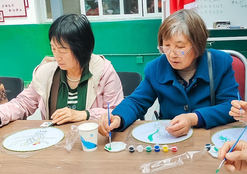 工作人员先给大家介绍团扇的由来及美好寓意,随后,给现场的老人们分发制作团扇的材料。构图、配色、调色……工作人员耐心地为老人讲解制作的步骤,老人们听得津津有味、跃跃欲试。