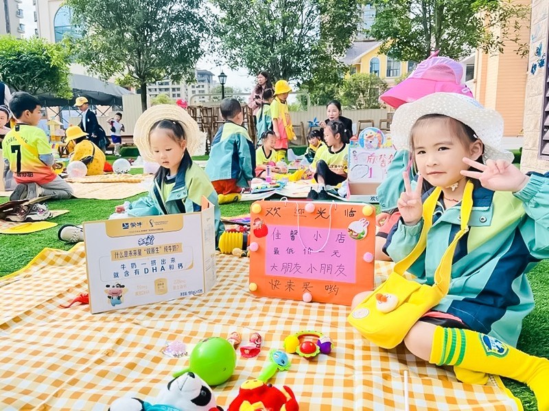 “小老板”们坐在自己的摊位前,热情地向往来的“顾客”推销自己的商品:“这本小飞机的书可好看了,你要不要买一本?”“你看这辆小汽车,按一下红色的键,他会发出不同的声音”。