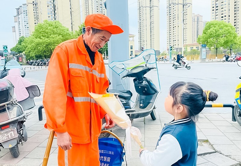 老师组织幼儿在节日前夕开展了“献花送给最美劳动者”的活动。通过此活动,教育孩子们从身边做起,从小事做起,好好学习,尊重他人,学会感恩,长大了用自己的劳动去创造更多的神奇,用自己的力量为祖国为社会服务。