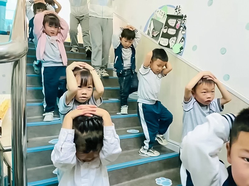 随着警报声响起,地震疏散演练开始,各岗位人员快速到位,各班老师立即告知幼儿“地震了,不要慌!”并指挥幼儿紧急避险,指导幼儿双手抱头,躲到安全区。