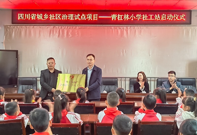 5月9日上午,四川省自贡市青杠林小学“盐童校园”学校社工站授牌仪式在青杠林小校如期举行,来自贡井区民政局、贡井区教体局、筱溪街道、金鱼河社区和青杠林小学的师生代表参与仪式活动。