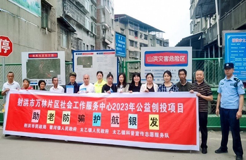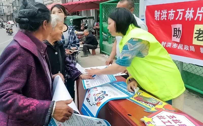 近年来,随着社会的发展,诈骗手法也不断翻新,不法分子利用老年群体文化水平相对不高、辨识能力较差等特点,以多种欺诈手段和“养老”名义实行诈骗,严重侵害了老年人的合法权益,为切实提高社区老年人防范新型养老诈骗的意识和能力,增强老年群体的防诈、反诈意识,保护老年朋友的“钱袋子”,5月25日,四川省射洪市民政局指导下,在瞿河镇政府、太乙镇政府支持下,遂宁春晖社会工作发展中心带领太乙镇政策宣讲志愿联盟服务队的志愿者和社工一起,为太乙镇的老年群体开展了“助老防骗、护航银发”防诈知识街头宣传活动。