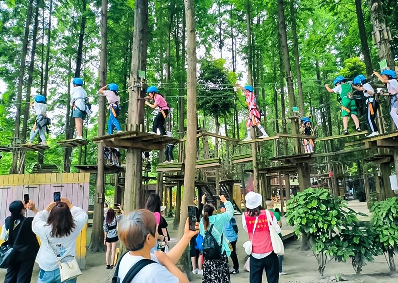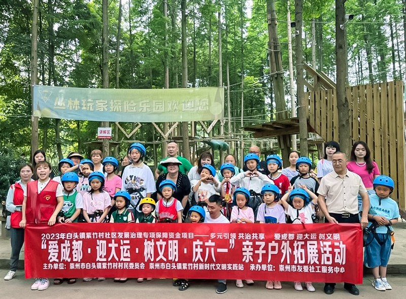 为营造爱成都·迎大运·树文明的良好氛围。5月28日,四川省崇州市白头镇紫竹村村民委员会联合崇州市友爱社工服务中心开展“爱成都·迎大运·树文明·庆六一”亲子户外拓展活动。所有参加的亲子家庭早早聚集在集合点,乘车前往都江堰猪圈咖啡,开启丛林探险拓展活动,意在磨炼孩子的勇气和毅力,让家长与孩子之间建立更加密切的联系。活此次活动有20余组家庭积极参与。