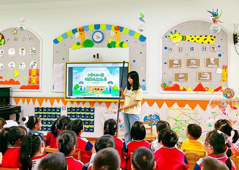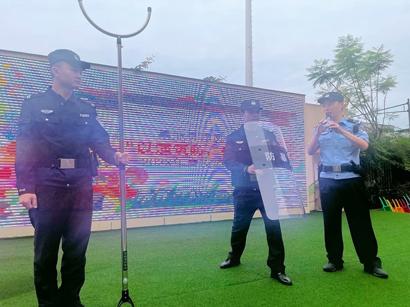 演练后执法人员对师幼进行了反恐防暴演讲,讲述了防暴盾牌、防暴棒、防暴叉的使用方法以及关于日常自救方法。主持人总结宣布反恐演练结束。