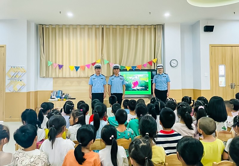 为进一步加强幼儿园法治安全宣传教育工作,增强幼儿的法制观念,巩固自我保护意识,更好地促进幼儿健康成长,使“安全防范、人人有责”思想深入人心,切实保障全体师幼的生命和财产安全。6月6日下午,四川省广安市岳池县成果路幼儿园邀请县交警大队何警官、李警官、杨警官走进幼儿园开展“法治相伴、快乐成长”的安全法治教育知识讲座。