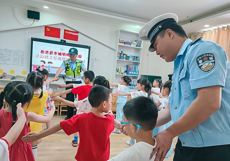 为进一步做好幼儿的法治宣传教育,增强师生的安全意识,提高幼儿自我保护能力,6月13日,四川省广安市岳池县东城明珠幼儿园的法治班主任杨江涛、刘洋两位警官来到该园,根据幼儿园孩子的认知特点,两位警官用浅显易懂的语言并结合图片给孩子们讲解了交通方面的安全知识,增强了幼儿自我保护意识和能力。