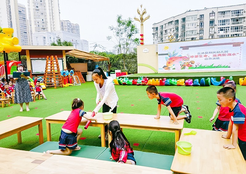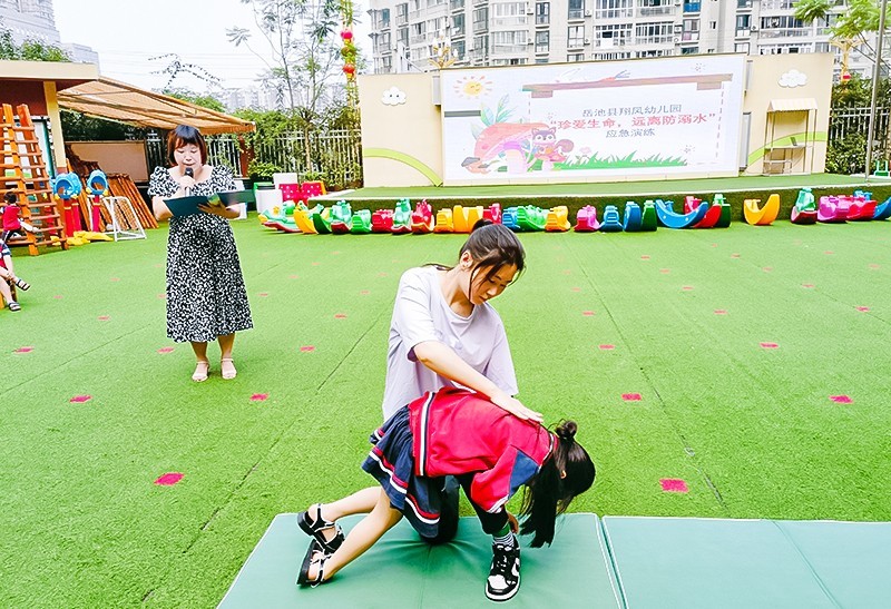 气温逐渐上升,防溺水安全教育不能放松。为有效预防幼儿溺水事故的发生,使幼儿了解防溺水的有关知识,认识溺水的危害,进一步提高幼儿防溺水的自觉性以及识别险情、紧急避险、遇险逃生、自护自救、抢救溺水人员的能力。感受生命的可贵,珍爱生命。6月19日上午,四川省广安市岳池县翔凤幼儿园组织师幼开展防溺水应急演练活动。