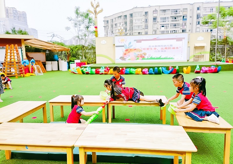幼儿园以情景模拟的形式,再现了几名幼儿玩水时两名幼儿不慎溺水后如何找到老师正确施救的场景,幼儿在紧张有序的演练中,进一步掌握了防溺水的方法和技巧。随后教师进行示范溺水后的急救方法,提升了幼儿自救自护能力以及增强幼儿安全防范意识。