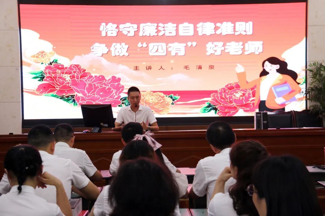 毛清泉以《恪守廉洁自律准则 争做“四有”好老师》为主题讲授了一堂内容丰富的党课,带领大家学习了两部准则的内容和意义,号召老师们进一步提高自身的思想政治素质和职业道德水平,时刻紧绷廉洁之弦,严守师德底线,争做新时代“四有”好老师。