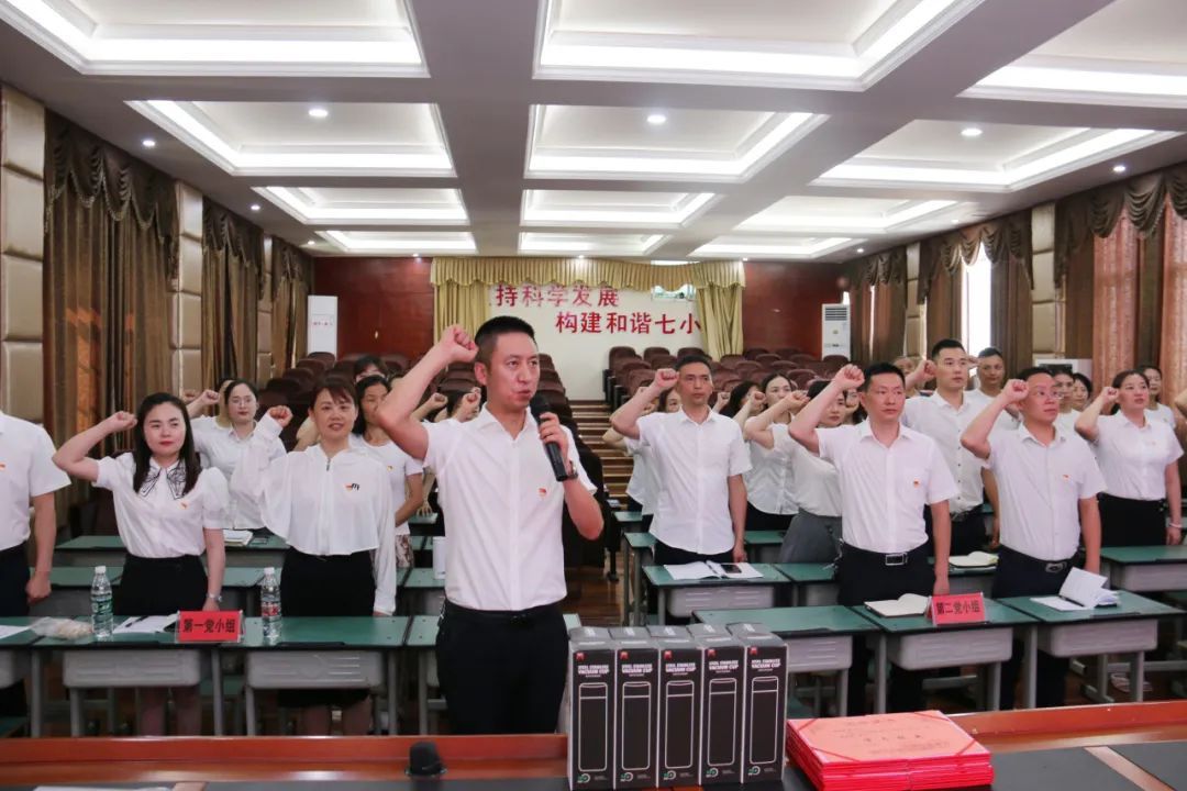 会议在庄严的国歌声中拉开帷幕。接着,在高坪七小教育集团党委副书记、高坪七小总支书记毛清泉的带领下,大家高举右手,重温入党誓词,坚定理想信念,用铮铮誓言表达为党的教育事业奋斗终身的决定。