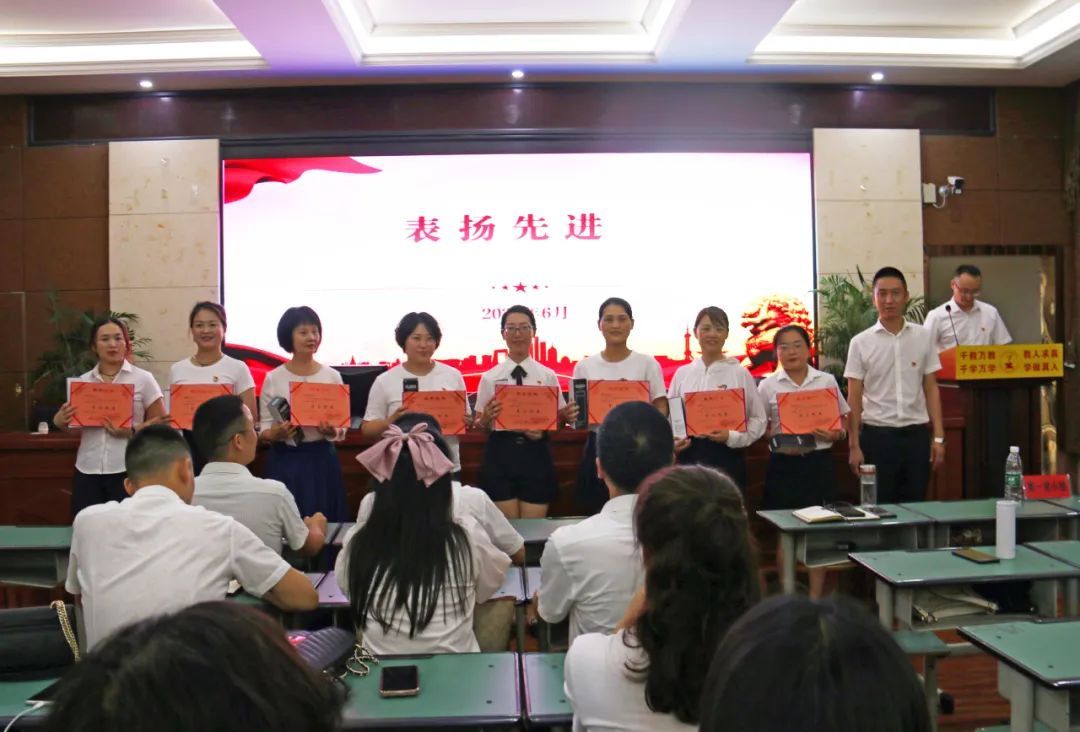 毛清泉为2022-2023年度“学习强国”总积分前10名的学习标兵颁奖。自“学习强国”平台上线以来,学校总支高度重视学习平台的推广和使用,老师们利用课余时间坚持打卡学习,掀起了学习热潮,如今学强国、看时政、学党史已成为七小党员干部的新风尚。