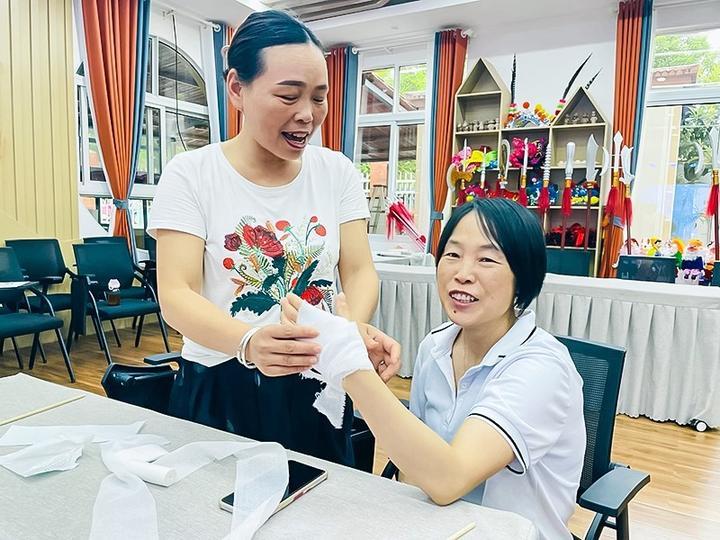 随着主持人念完第一道题的“抢答开始!”现场变得紧张而激烈,保育员们争先答题,豪不示弱。大家在答题过程中重温了日常保育、幼儿护理、突发意外伤害处理等方面知识,以便在实践中更好的运用。在意外伤害应急处理实操环节,保育员们熟练规范地展示了伤口包扎中的环形包扎法、八字包扎法;当她们敏锐地观察到有人噎到(模拟扮演)时,立即运用海姆立克急救法为其脱离危险。当她们面对凌乱不堪的被芯、床单、被套,立即认真投入的进行整理,迅速让床铺、被子变得平整美观,让我们看到了保育员们日常工作中的严谨和细致。