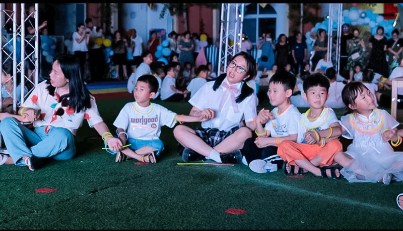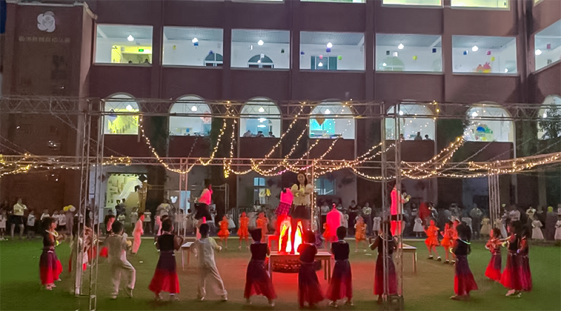 紧接着,身着各色荧光棒的孩子们在操场上拉手围圈,小火炬手们迅速将火炬传递到点火区,刘园长和幼儿代表点燃象征着希望的火苗。