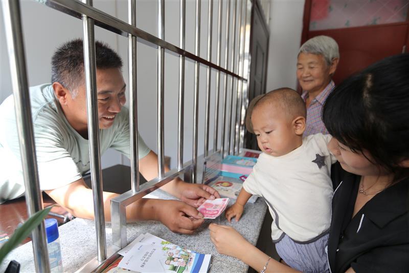 8月9日,河南省安阳市殷都区都里镇东郊口村中原银行普惠金融服务站,站长孟庆堂(左)把300元现金交给留守村妇孙莹莹的手里,这是她外出打工的丈夫麦收后第6次给她们母子二人“汇款”了。中原银行安阳分行惠农部自去年8月在村里设立普惠金融服务站以来,极大地方便了村民的生产生活。 据中原银行安阳分行惠农部史晓巍介绍,全市310个普惠金融服务站点遍及城乡各地,重点在偏远的山村,只要有网络信号就会有中原银行普惠金融服务。