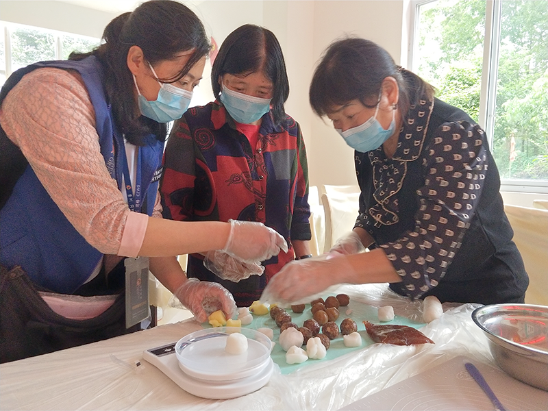 活动现场,社工将制作月饼的手套、模具、馅料等材料准备妥当,详细讲解并示范了冰皮月饼制作的方法及过程:揉面团、包馅、放模具内按压成型。“制作月饼时,一定不能用蛮力,手要灵活。”工作人员拿起一个冰皮饼皮包上馅儿做起了示范,不出一会儿的功夫一个月饼就出现在大家的眼前。同时工作人员还对食用月饼的饮食禁忌进行了科普。整个活动现场欢声笑语,其乐融融,现场弥漫着一派欢乐的气氛。“社区这次活动安排的真好,今天下来我也会做月饼了,以后想吃月饼就可以自己做了,太巴适了。”参与活动的王阿姨讲到。