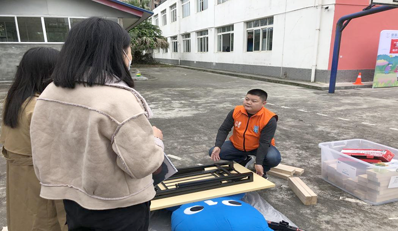 志愿者老师用人偶、木块、桌板、重物等模拟安全事故现场,人偶咚咚遭遇地震,被重物压住了全身,孩子们要通过千斤顶工具和木块想办法把咚咚救出来。
